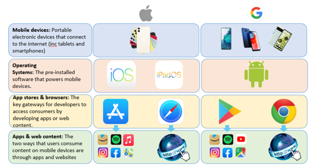 - The extent of competition between Apple and Google in mobile ecosystems, which include barriers to competitors offering rival products to them on their platforms;